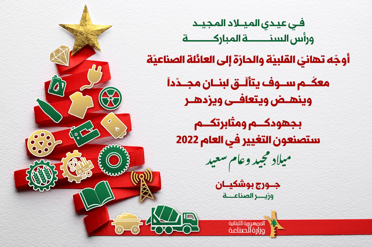 وجّه وزير الصناعة جورج بوشكيان تهانيه إلى اللبنانيين والعائلة الصناعية بعيد الميلاد المجيد، وقال:"معكم سوف يتألّق لبنان وينهض مجدّداً ويتعافى ويزدهر. بجهودكم ومثابرتكم ستصنعون التغيير في 2022. وطننا غالٍ وعزيز علينا جميعاّ، مقيمين ومغتربين. يستحقّ منّا التضحية، ولن نبخل بالعطاء على جيل المستقبل، جيل الغد لإعادة بناء لبنان الجديد. سوف نسلّمهم وطناّ يليق بالإنسان. لم يفقد اللبنانيون الأمل في عزّ الحروب والأزمات. ولن يستسلموا اليوم. الرجاء كبير والعزيمة أكبر مع ميلاد المسيح، سيّد السلام والمحبة.