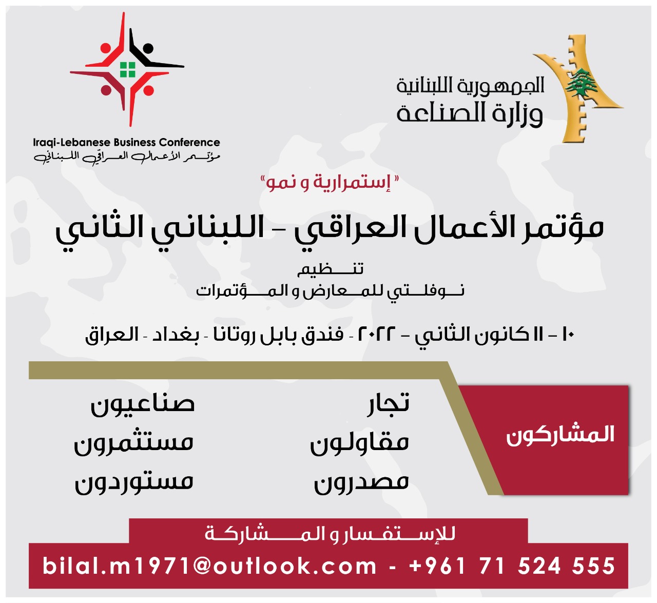 يفتتح وزير الصناعة جورج بوشكيان مؤتمر الأعمال العراقي – اللبناني الثاني الذي تنظّمه مؤسسة نوفلتي للاستشارات والمعارض والمؤتمرات في العاصمة العراقية بغداد يومي الاثنين والثلاثاء 10 و 11 كانون الثاني 2022، في حضور ومشاركة مسؤولين عراقيّين ولبنانيّين من القطاعين العام والخاص وصناعيين ومستثمرين ورجال أعمال من كلا البلدين حريصين ومهتمّين بتقوية العلاقات واقامة شراكات أعمال وتبادل بين لبنان والعراق.